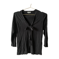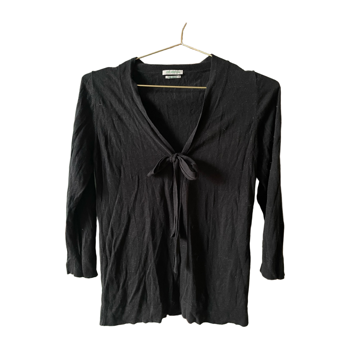 Musta silkkiseos neulepusero, solmimisnauhalla edessä.