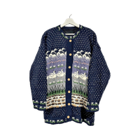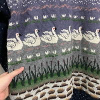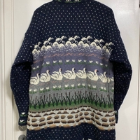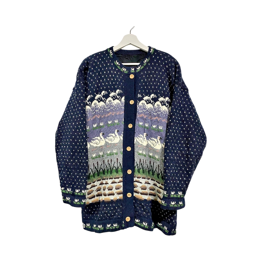 Kaunis vintage lilac-sininen villaneule/villapaita neulepusero joutsen- ja järviaiheilla ja klassisia puunappeja. Kainalo-kainalo 54cm, pituus 77cm, vastaa koko L mielestäni. Pehmeä, paksu ja lämmin villa kangas. Tässä erikoismallissa on sisävuori (katso viimeinen kuva), mikä tekee siitä ihoa miellyttävämmän käytön aikana.