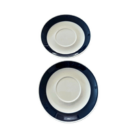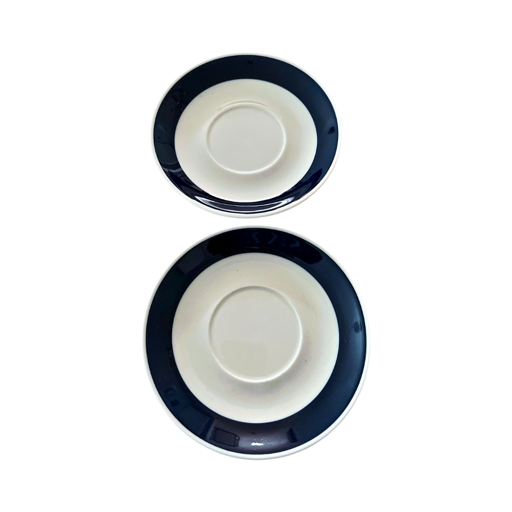 Kaksi posliinialustaa, valkoinen pinta ja tummansininen reuna.