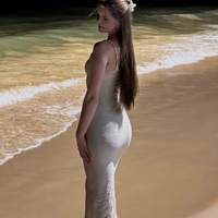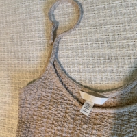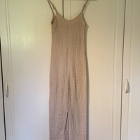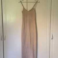 Pari kertaa käytössä ollut beige kesämekko, jossa takana pieni halkio.