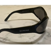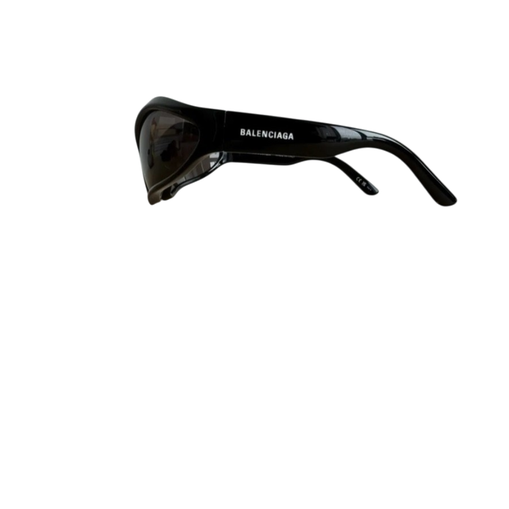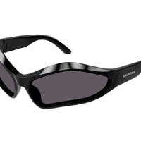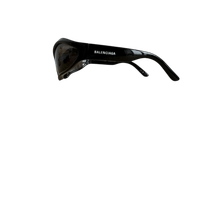 Chunky black wrap sunglasses with grey lenses, designer logo temples.