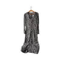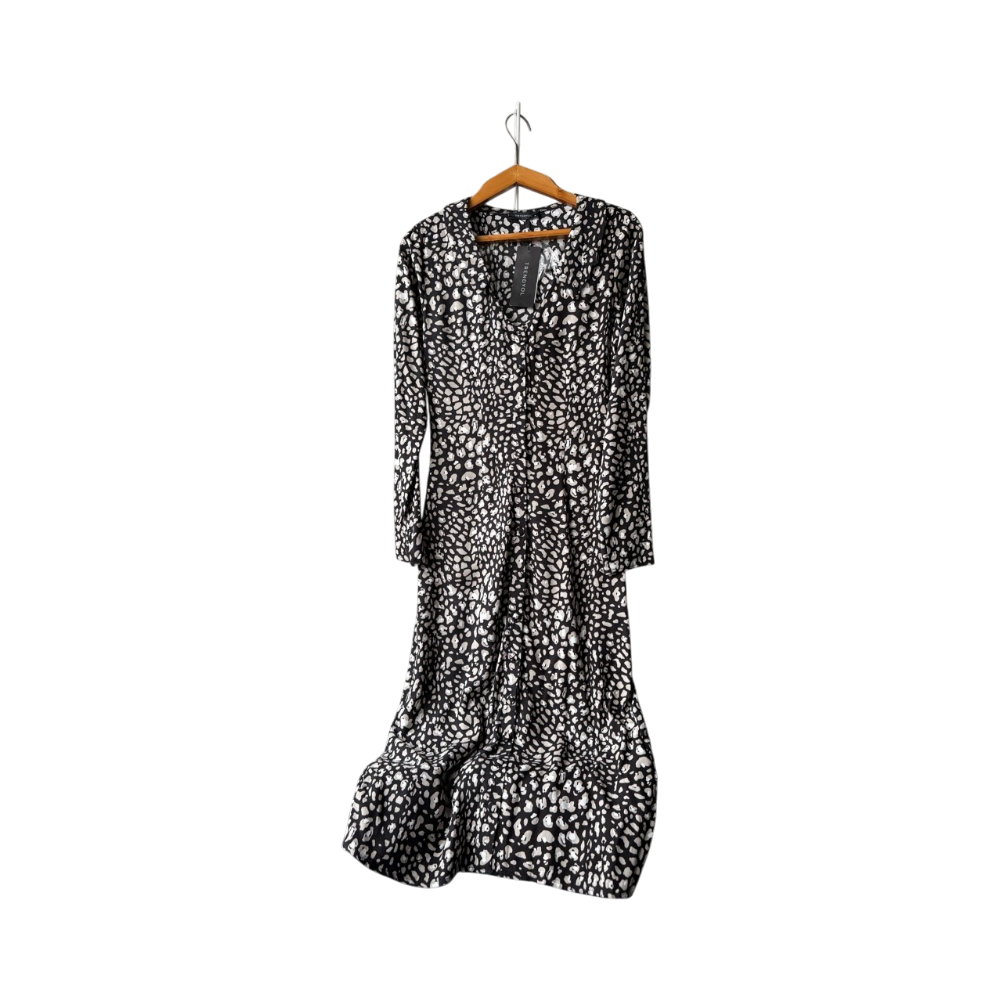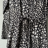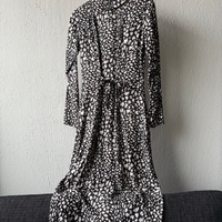 Maksipituinen pitkähihainen paitamekko. Edessä nappikiinnitys ja selässä solmittava nauha. Koko 36, kainalo-kainalo 45 cm ja pituus 121 cm. Kangas kevyttä viskoosia. Uusi ja laput kiinni.