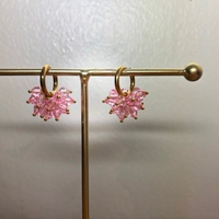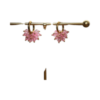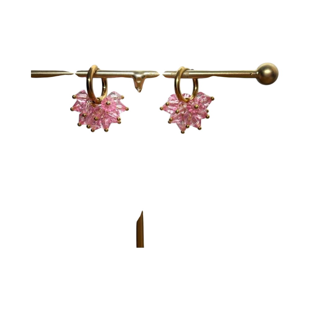 Pinkit kristalliset rypäskorvikset, allergisoimaton rengas. Pienet, pituus noin 2cm. Uudet.