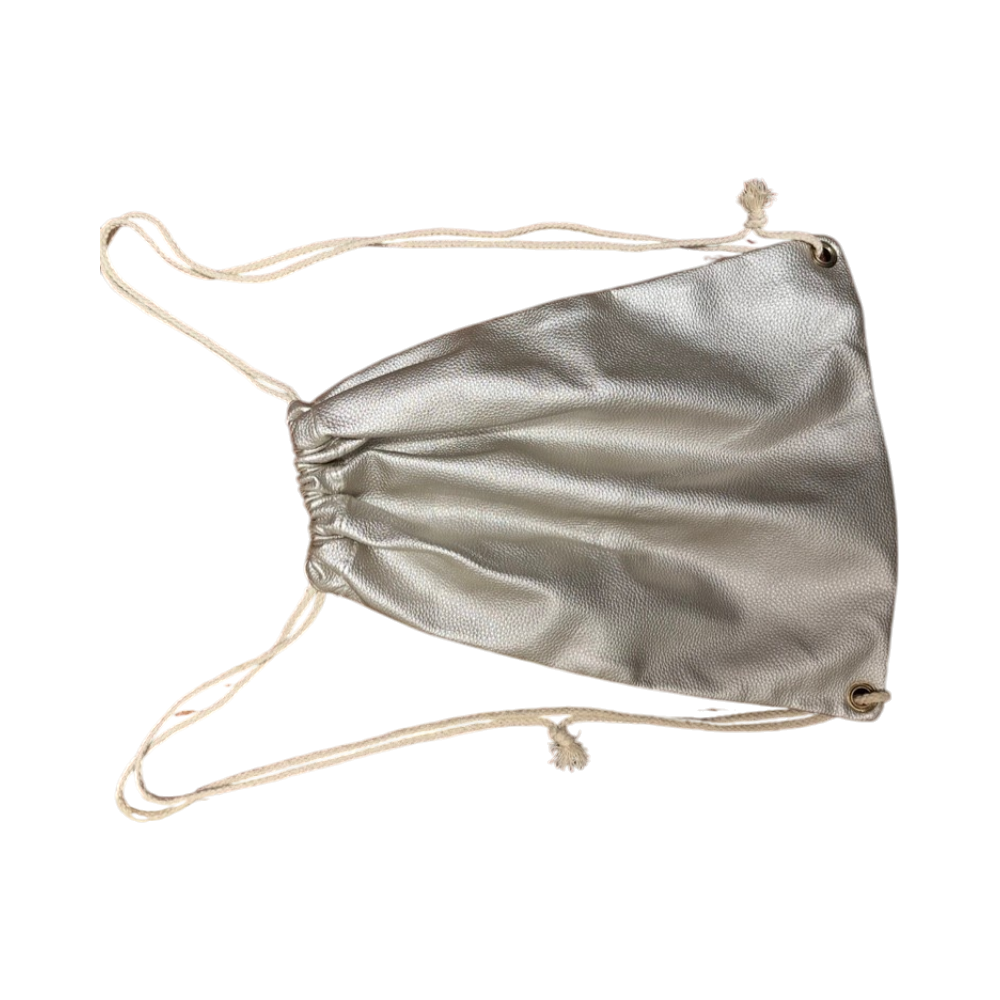 Metallic silver drawstring gym backpack with rope straps. Never used. Inside a little bit some drawing (3rd pic, don’t know where it has come but maybe was in the texture when it was made already)