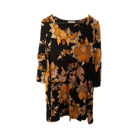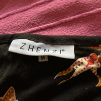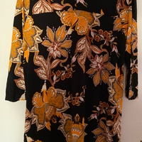 Tunika, musta pohja ja oransseja kukkakuoseja, 3/4-hihat. Uusi käyttämätön tunika, laput valitettavasti poistettu. Edessä vale vetoketjutaskut. Oranssi on tämän syksyn muotiväri. Itsellä jäänyt valitettavasti käyttämättä tämä kaunis tunika. Huomio koko on M, mutta ZHENZI myy tuotteita plus kokoisille, että arvioisin koon olevan 44-46