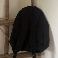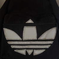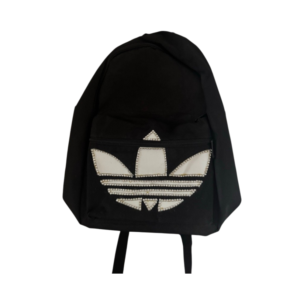 Mustavalkoinen reppu, strassikoristeella ja edetaskulla. Strassikoristeet olen liimannut itse reppuun.