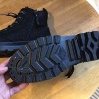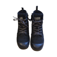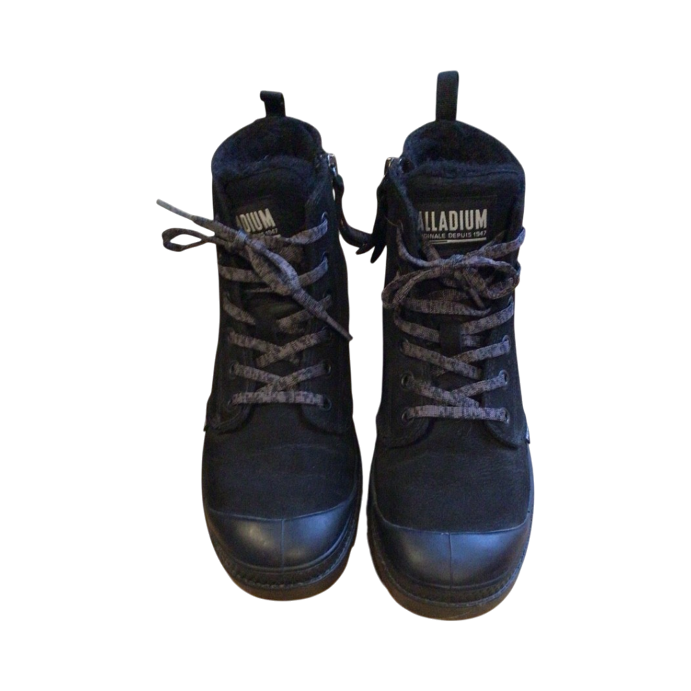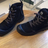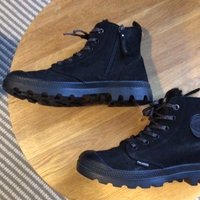 Palladiumin mustat mokkanahkaiset talvikengät. Kokolapussa 38, mutta oikeasti kokoa 37. Kerran kokeiltu, liian pienet meille. Sivuilla vetoketjut, pohjat aika rouheat ja karvavuori tuntuu lämpöiseltä. Malli Pampa Hi Zip WL, mukaan tulee oma laatikko.