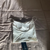 Lyhyt valkoinen hihaton toppi, ohuet olkaimet. Irroitettavat kupit. Uusi käyttämätön, sisäpuolella pieni meikkitahra.