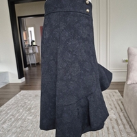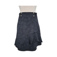 Features a subtle floral textured pattern, decorative gold-tone buttons on the waistband, and a flattering layered ruffle hem. Hidden side zip closure.