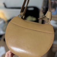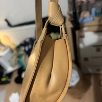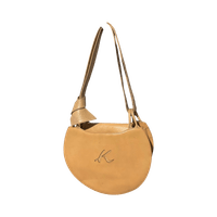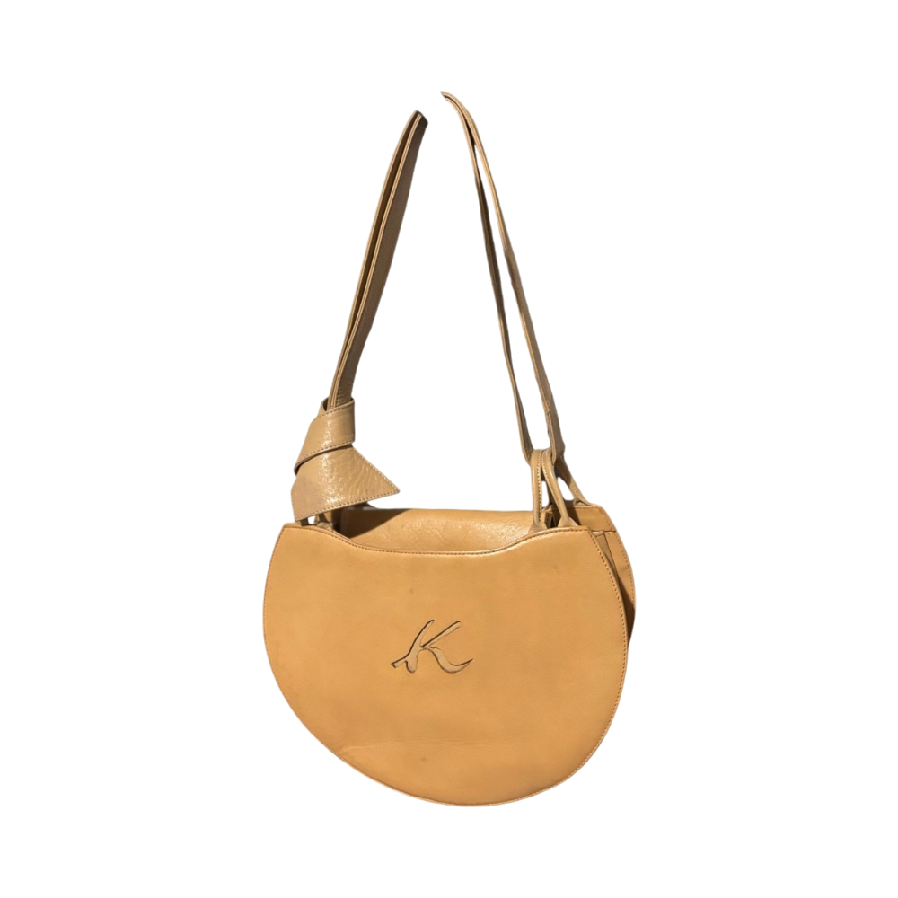 Small crescent-shaped tan shoulder bag, single strap, worn patina.