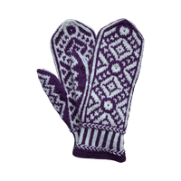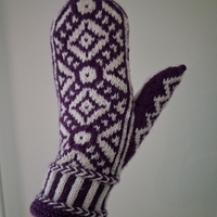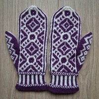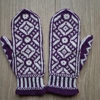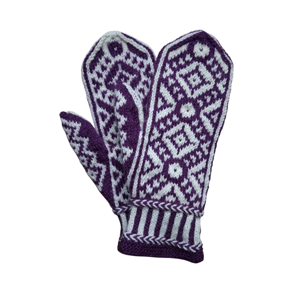 Käsin neulotut käyttämättömät kirjoneulelapaset. Luonnonvalkoista ja violettia. Kokonaispituus noin 25 cm, josta varsi noin 5,5 cm. Kämmenen leveys noin 9 cm. Kuvattu hanskakoon 7,5 kädessä.