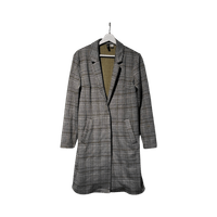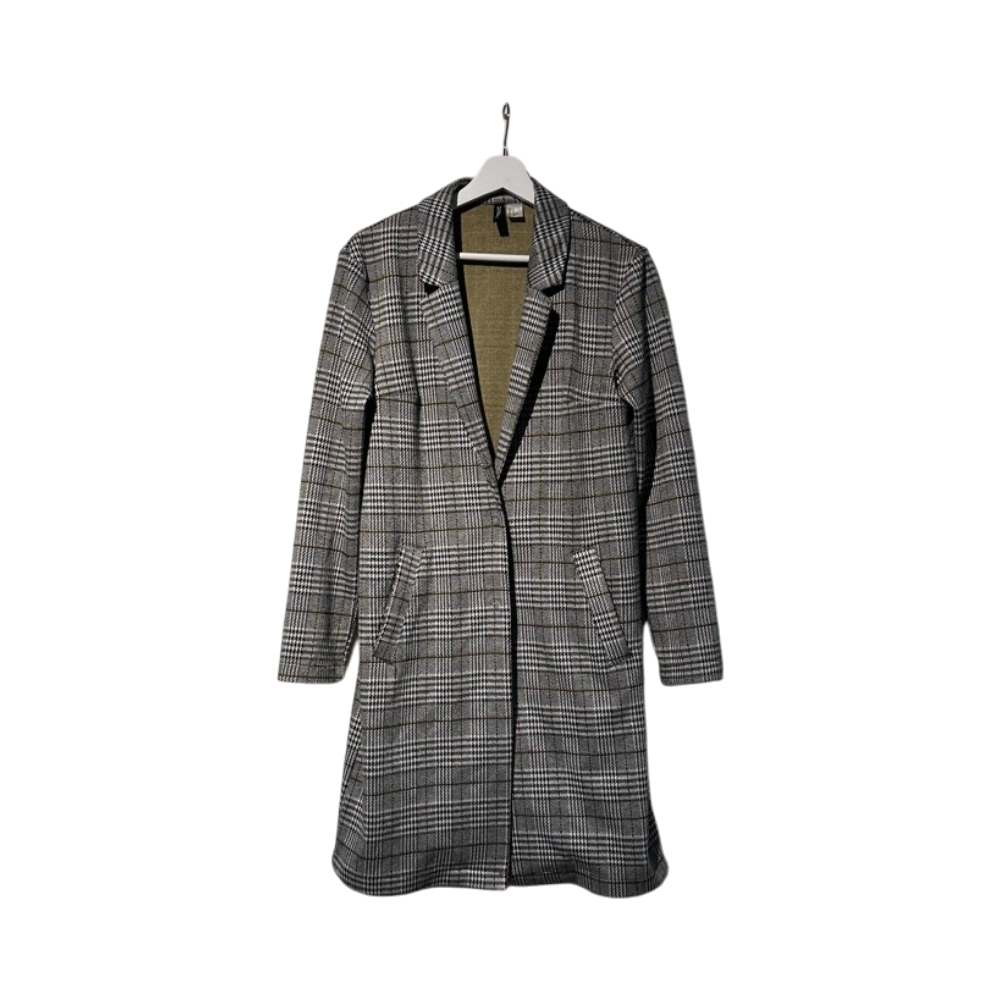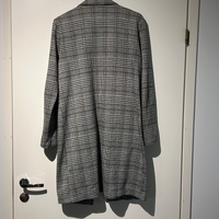 Pitkä harmaa takki, taskut, siisti ja pehmeää joustavaa kangasta.