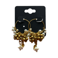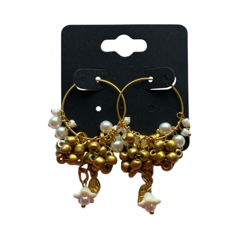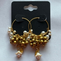 Roikkuvat korvakorut kullanvärisillä yksityiskohdilla. Näyttävät mutta sirot, renkaan halkaisija noin 2,5cm.