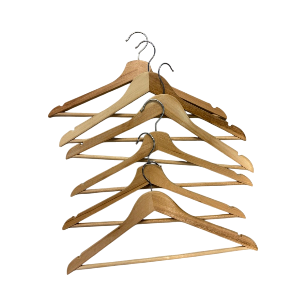 Kuusi puista vaateripustinta housutangolla, hyväkuntoiset.