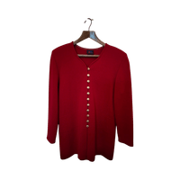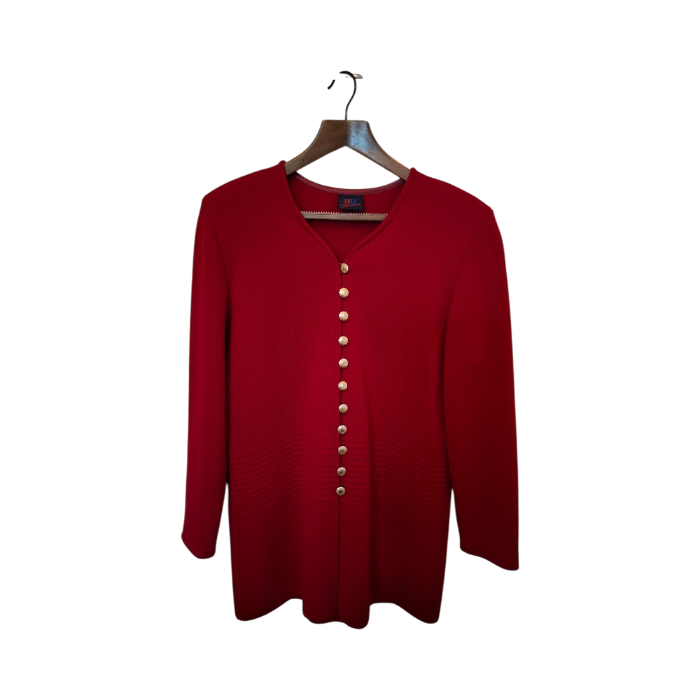 Pitkä viininpunainen neuletakki / neulebleiseri kultaisilla napeilla.