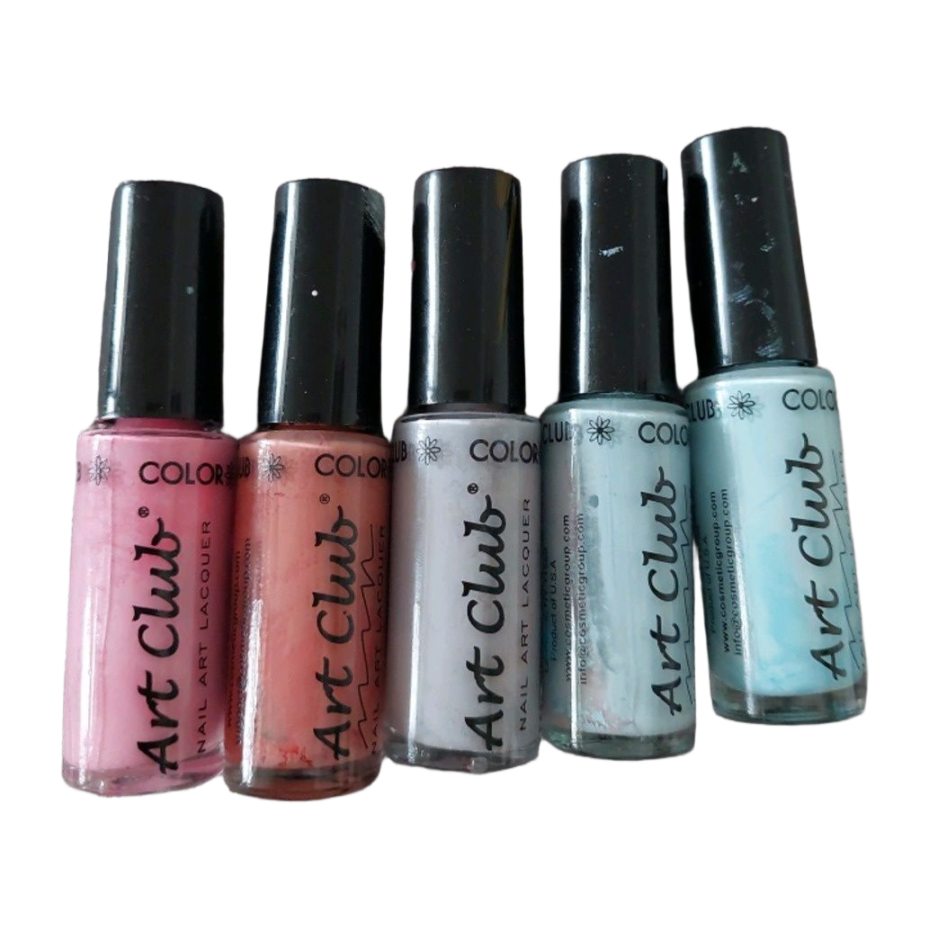 Art club -kokoelmaa, ihania hempeitä pastellisävyisiä kynsilakkoja ohuella siveltimellä, jolla on helppo tehdä hienoja koristeluita kynsiin. Suurin osa vain kokeiltu, hyvässä kunnossa olevia lakkoja.