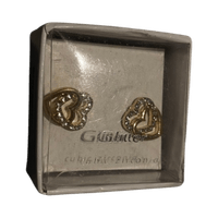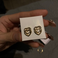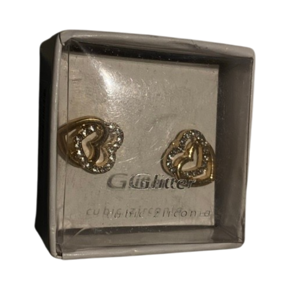 Kultaiset sydänkorvakorut, pieniä zirkoniakiviä reunuksessa.