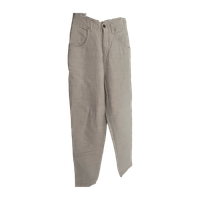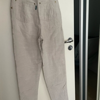 60% pellavaa, 40% puuvillaa. Ostettu käytettynä, olikin itselle liian pienet. Sopii S-kokoiselle. Kapeat lahkeet.