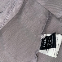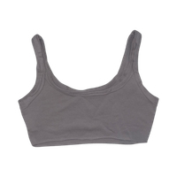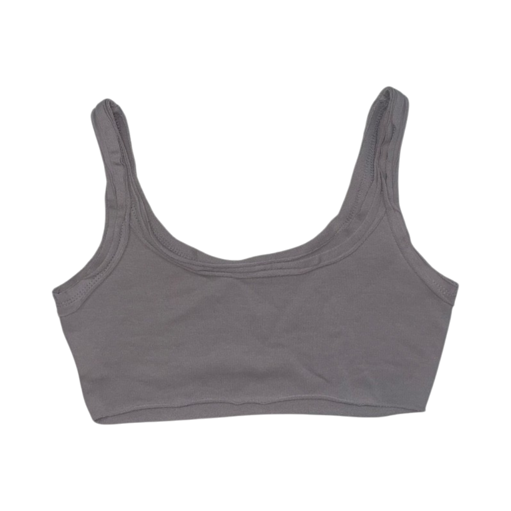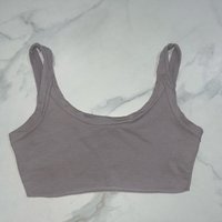 Lyhyt pehmeä toppi harmaan/liilan sävyinen.