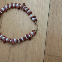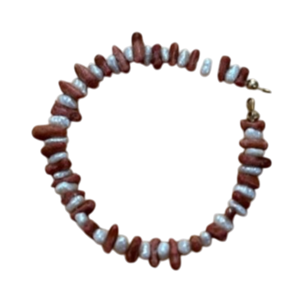Handmade-style bracelet with alternating coral and freshwater pearls.