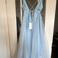 Pitkä tyllimekko, syvä V-kaula ja ristiin solmittavat hentusetit.