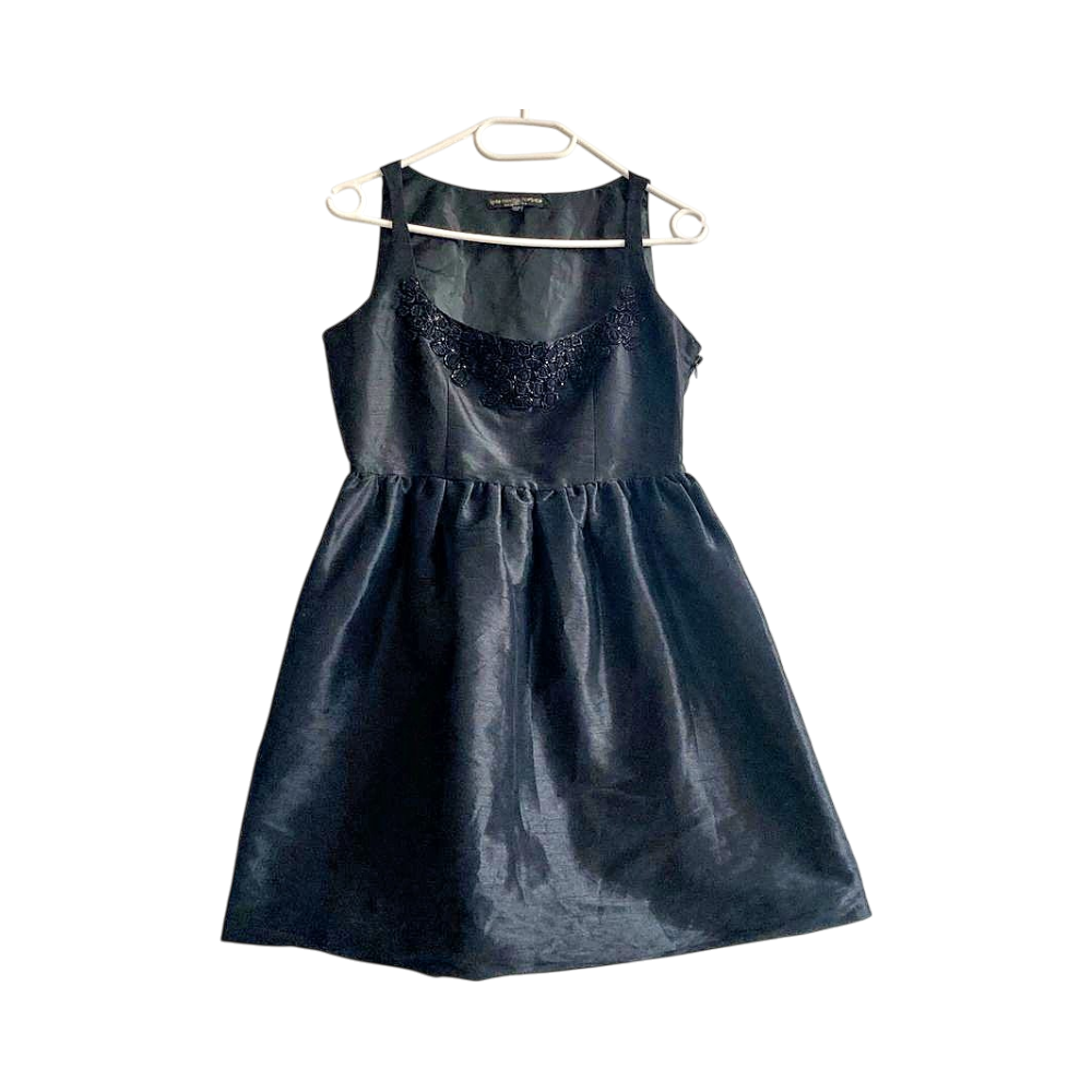 Keywords: Kate Moss, Topshop, silk blend, satin dress, black mini dress, babydoll, cocktail dress, party dress, LBD, elegant, evening wear, rare, iconic, embellished neckline, timeless aesthetic