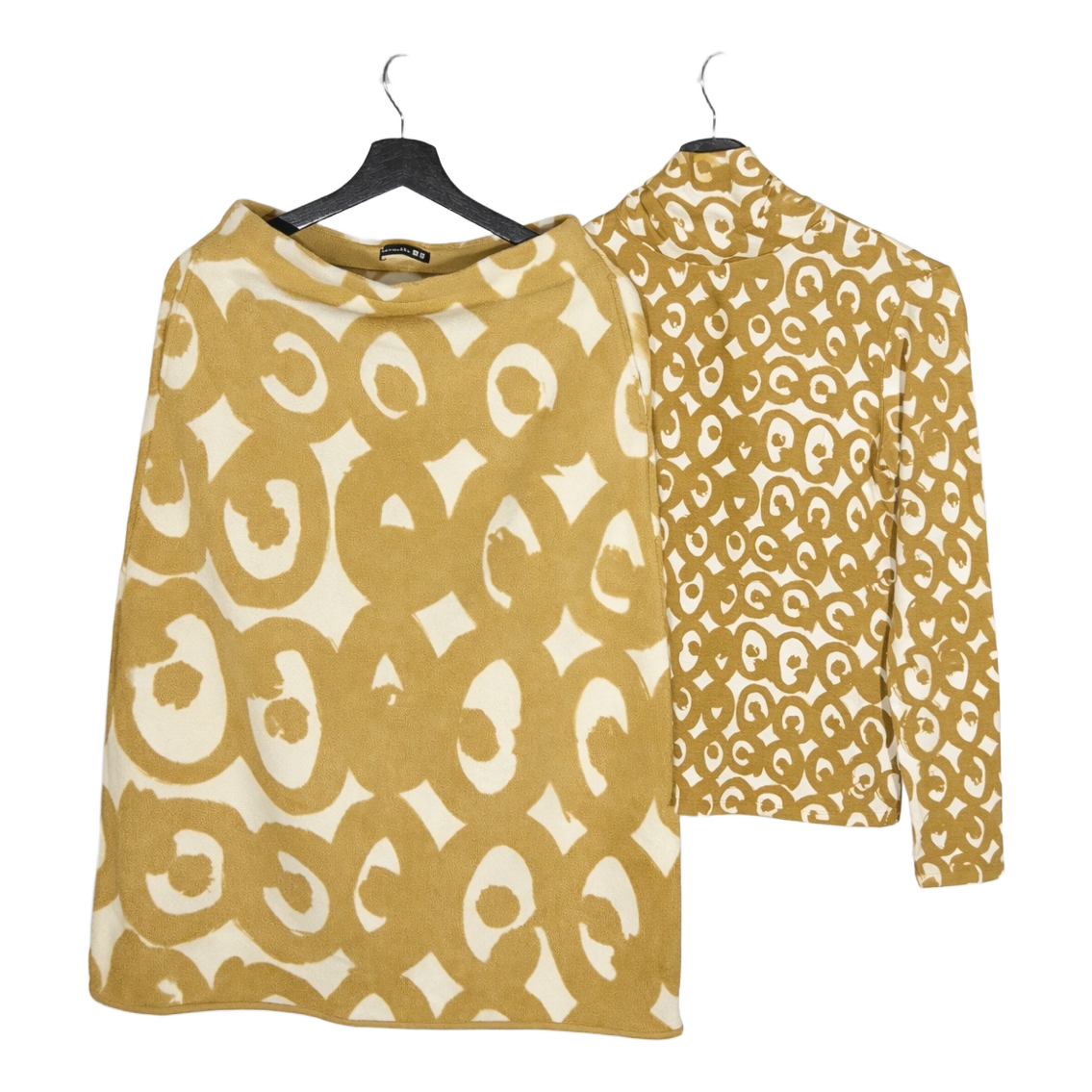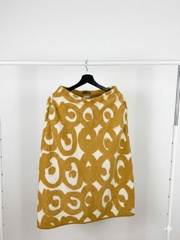 Patterned midi skirt in mustard and cream tones. Features a circular print design. New.
