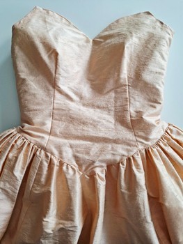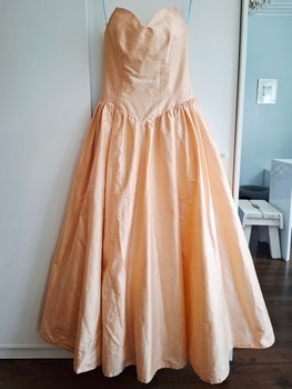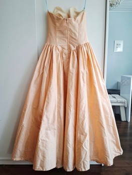 Strapless maxi dress in a soft apricot shade. Features a fitted bodice and a full, flared skirt with a back zipper closure. Thick, vibrant silk. Includes the little, matching pouch seen in fitting pictures!