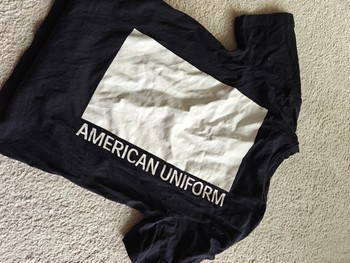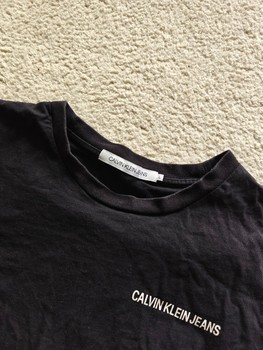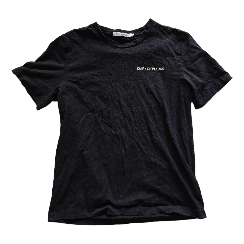 Black T-shirt with the brand logo at the front and a print on the back. Size L (runs small; in my opinion corresponds more to M).