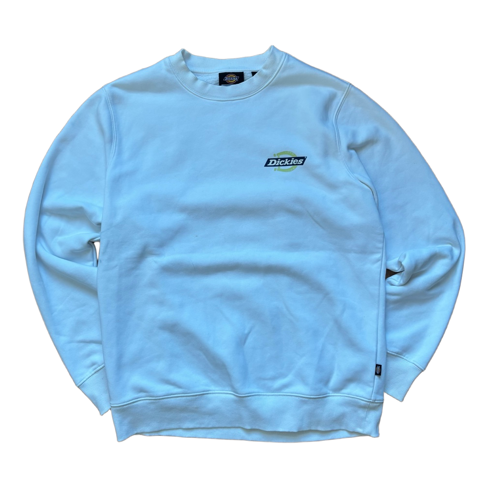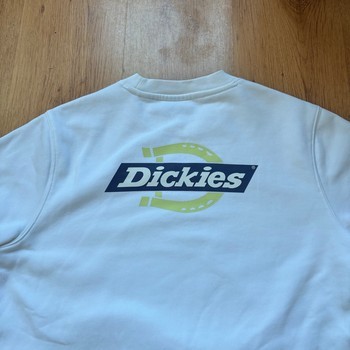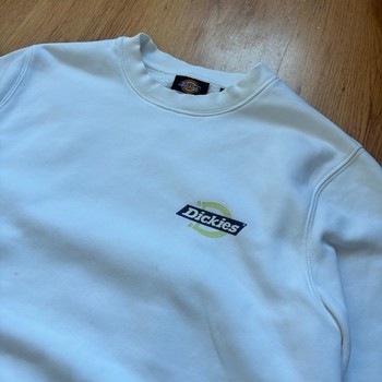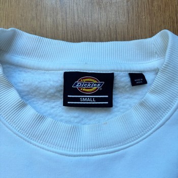 White sweatshirt with a logo print on the chest and back. Features a rounded neckline and ribbed cuffs. Size S.