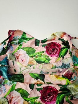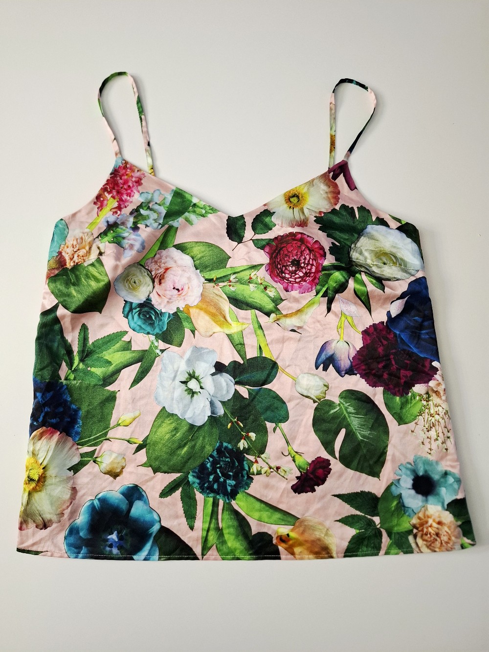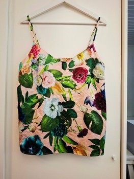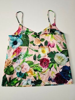 Floral print camisole top with spaghetti straps. Size S, made from a cotton and silk blend.
