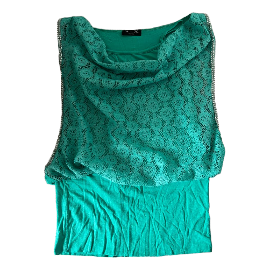 Green top with lace overlay. Decorative rhinestones on the straps. Y2K 2000s. Tise: _ria_. Vinted: pikkumyy112