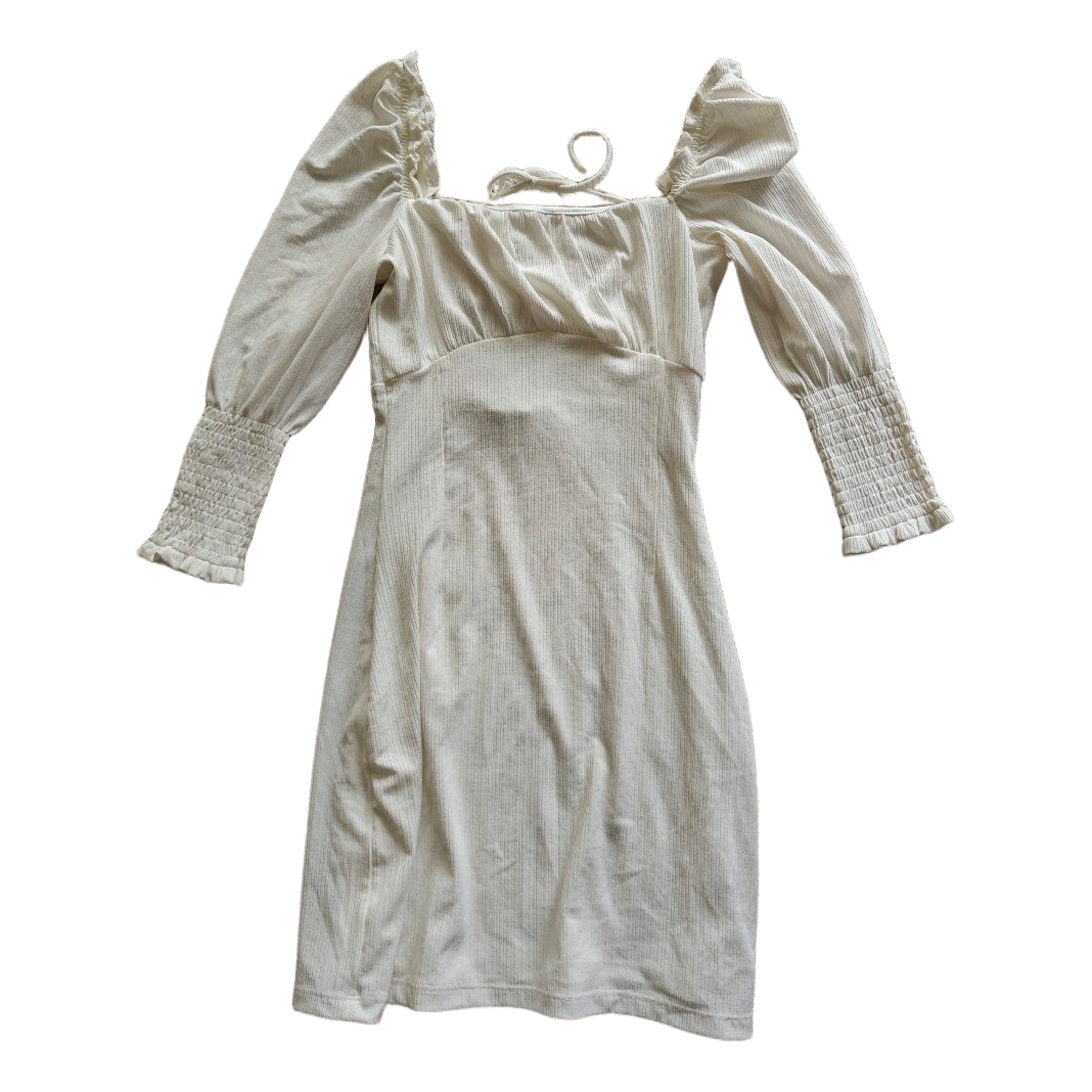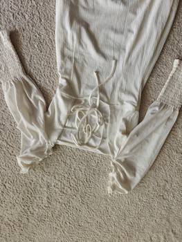 White dress with lacing at the back and ruched sleeve cuffs. Size XS. Worn once. Very stretchy fabric