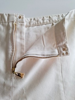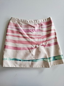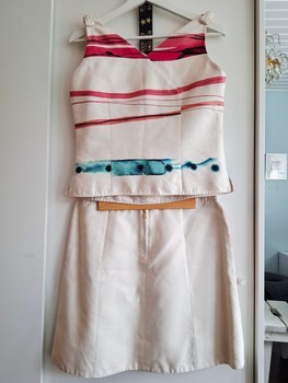 A truly unique set with a bow-decorated top and skirt. Both are lightly lined. Size 38, corresponds to size M in Finland. Skirt has a back zipper closure, top has a side zipper. Both have branded zippers. Fabric has brand print.