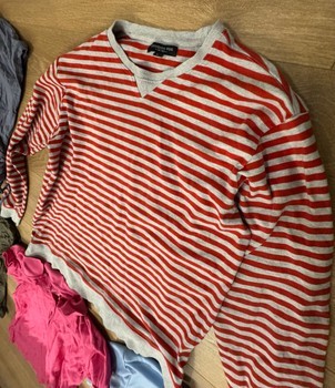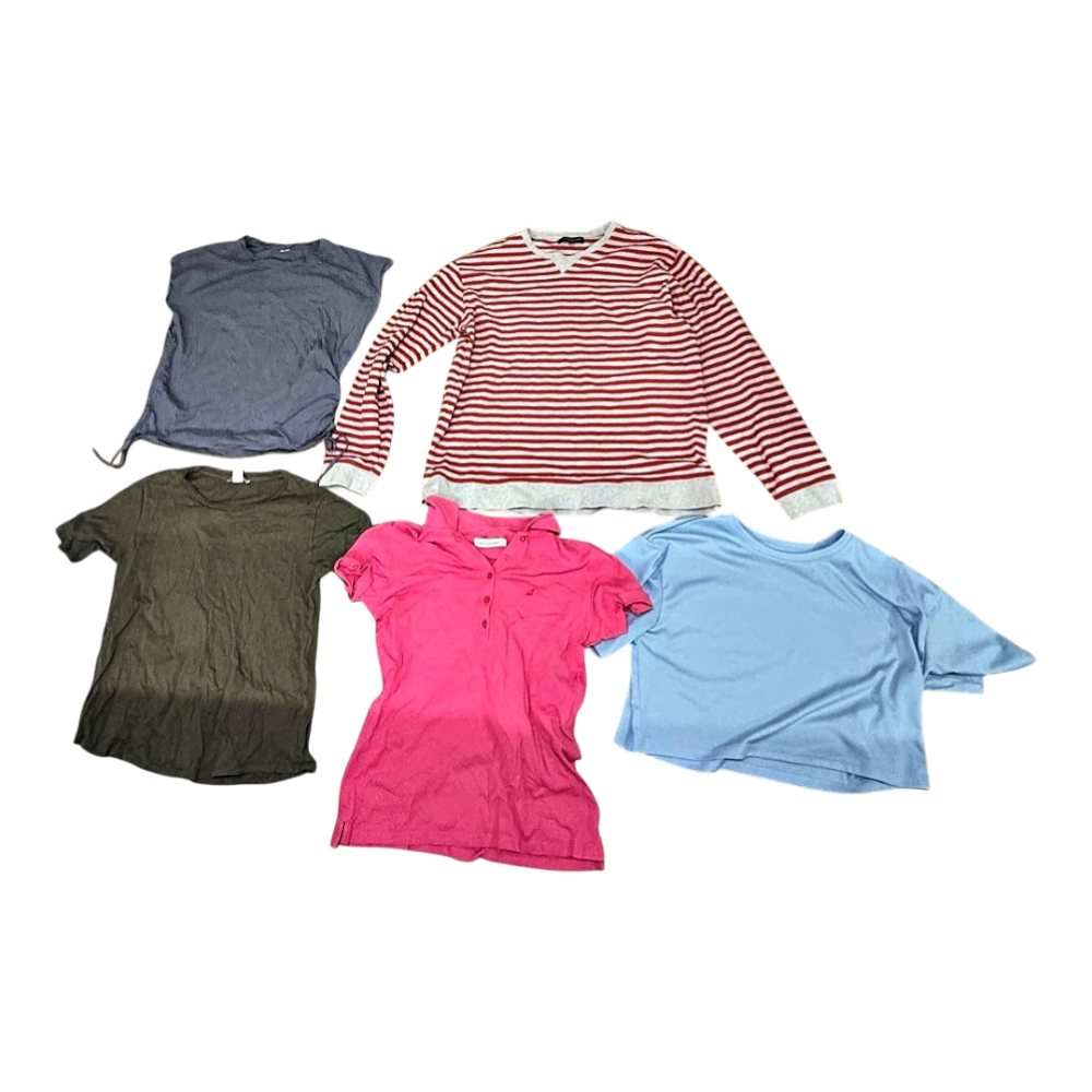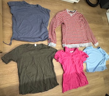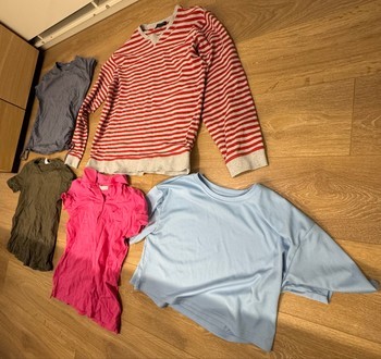 For sale in condition shown in the pictures women's clothing package / girls' clothing package. In this clothing package the condition of the clothes varies from good condition to very good/almost like new. All garments included in this clothing package have size labels either “L” or “40” (size 40 corresponds to size L). The total price in this sales listing includes all the clothes visible in the pictures of this listing (I do not sell clothes individually/separately – the clothes are sold only and exclusively as a package): • 1x grey-blue T-shirt • 1x camo-green Amisu T-shirt • 1x light blue sports T-shirt • 1x pink athletic Peak Performance T-shirt • 1x striped vintage London Fog long-sleeved