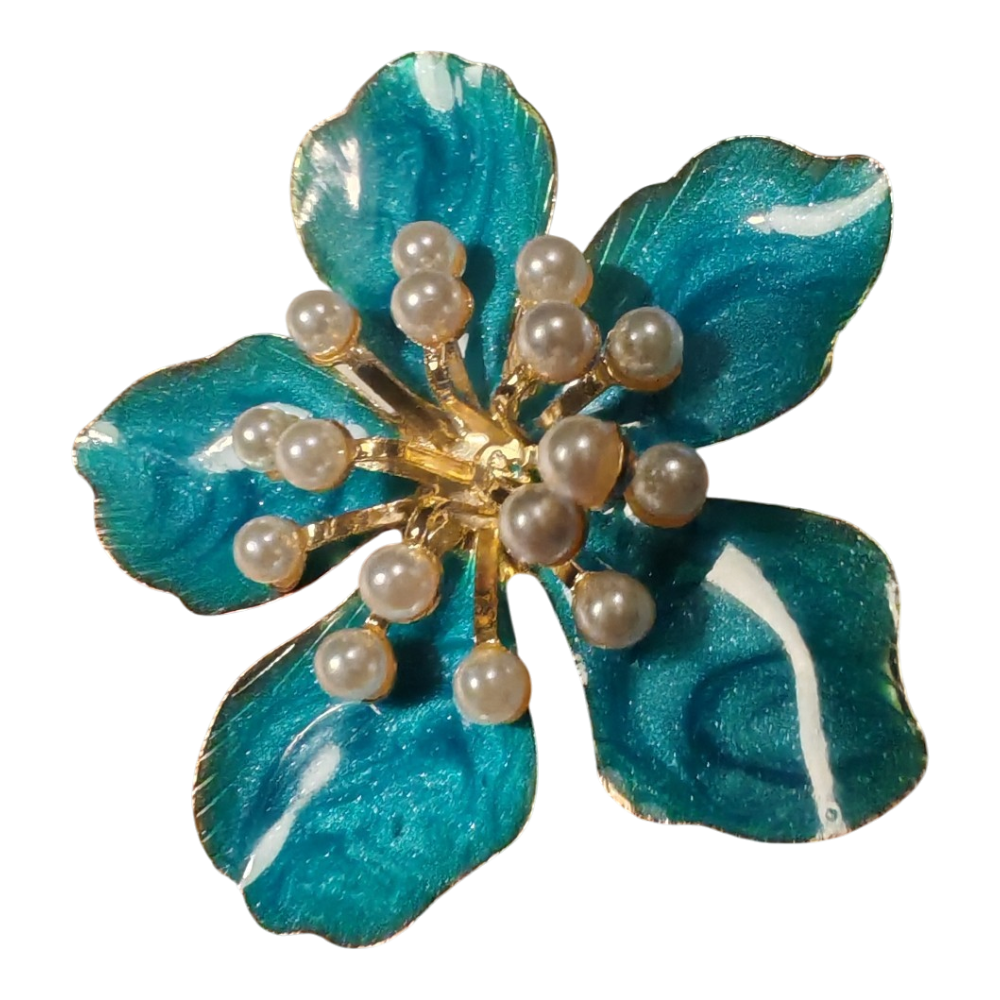 Showy turquoise flower ring with mother-of-pearl decorations.