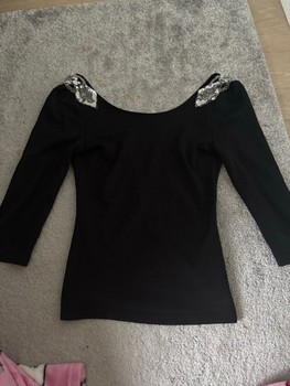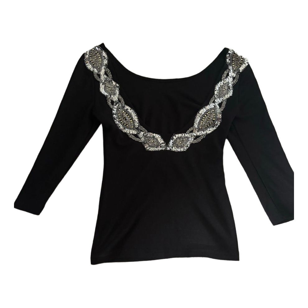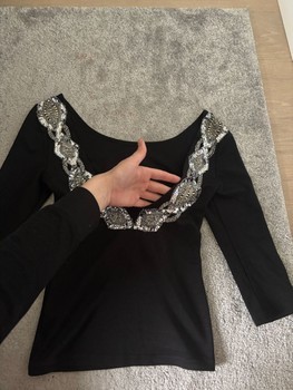 Black long-sleeved top with a showy sequin embellishment on the back. Size XS.