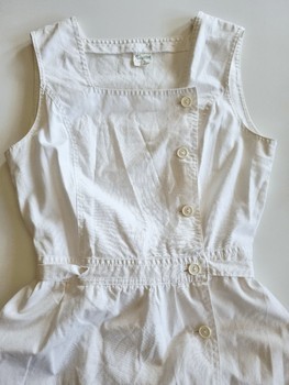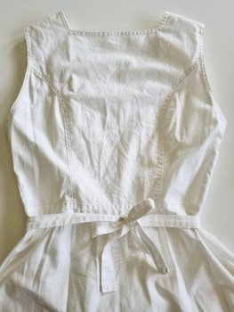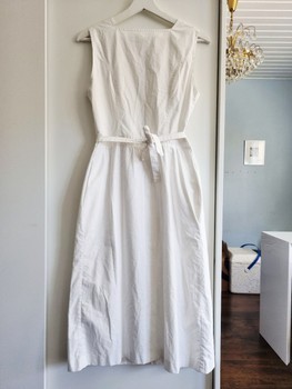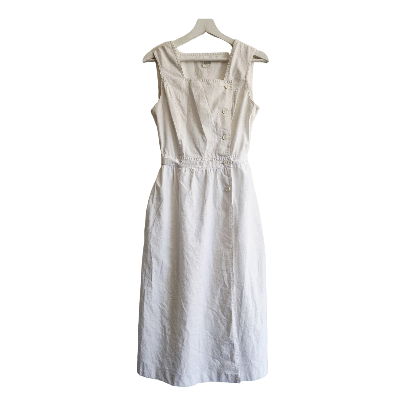 White sleeveless midi dress made of 100% cotton. Features a front-opening button placket and waist-tying straps. Side pockets! Thicker, soft, breathable cotton. Measurements: pit-to-pit 46 cm, width at waist 36 cm, length shoulder-to-hem 111 cm. Excellent condition, no issues. Check also my other listings, combined shipping possible! Please do not make extremely low offers, thank you.