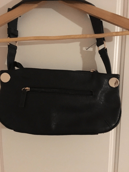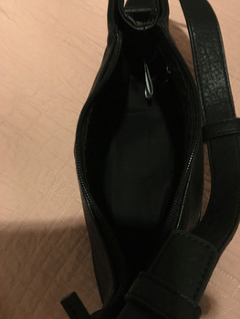 Black faux leather bag, used once. Measurements 13x31. Zip fastening, on the outside one zip pocket. Inside a pocket, as well as a zippered pocket. Neat bag.