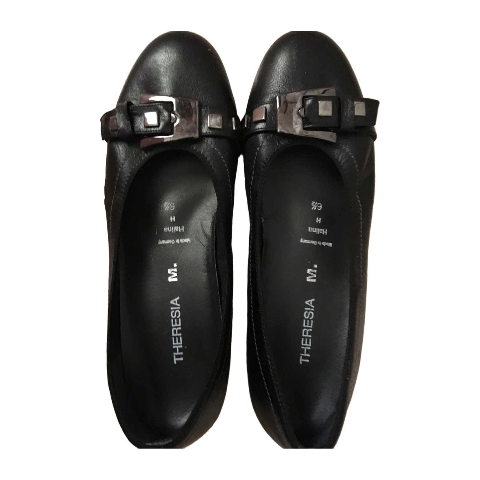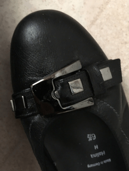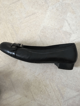 Black leather shoes that have been worn somewhat, but are too small for me. With silver-colored decorative buckles. Nice shoes even as office shoes for work. The heel height is 2 cm. Offers only for purchasing purposes, thanks!