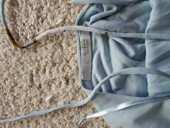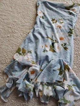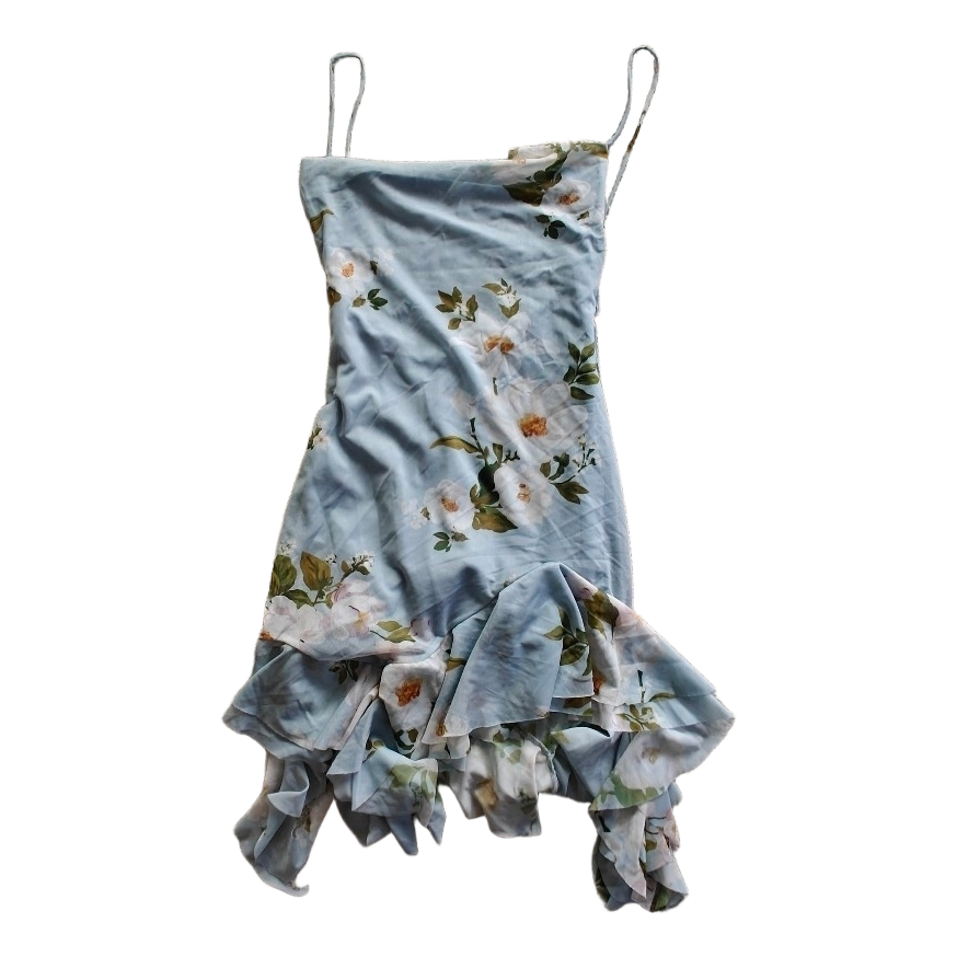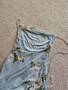 Light blue floral patterned party dress with thin straps. Slightly open back at the top, tied at the back with strings. Stretchy fabric. Size S. Unused!