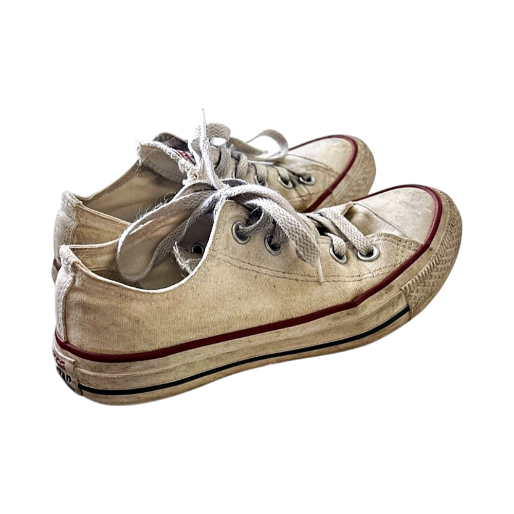 Heavily used white low-top Converses