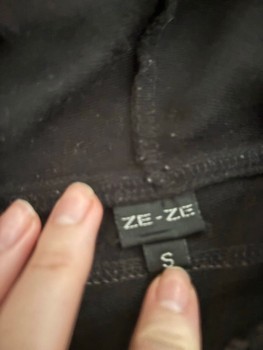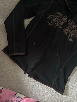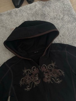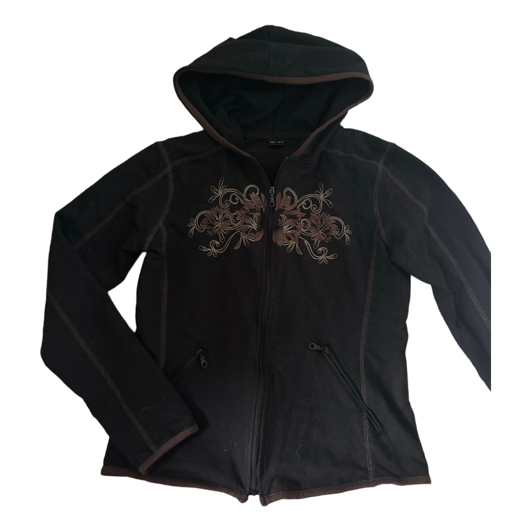 Black zip-up hoodie, with flower embroidery on the front and zippered pockets. Size S.