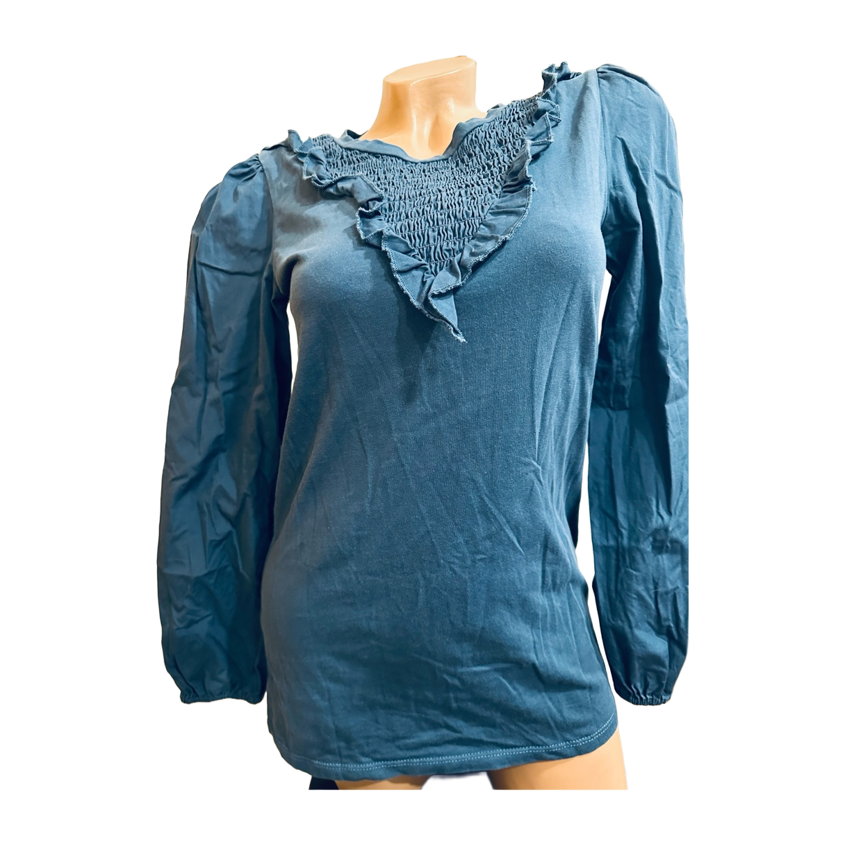 Dark blue maternity shirt from Mamalicious. Smock gathering and ruffles at the front. Perfect for the expectant mother – 100% cotton, light and breathable.