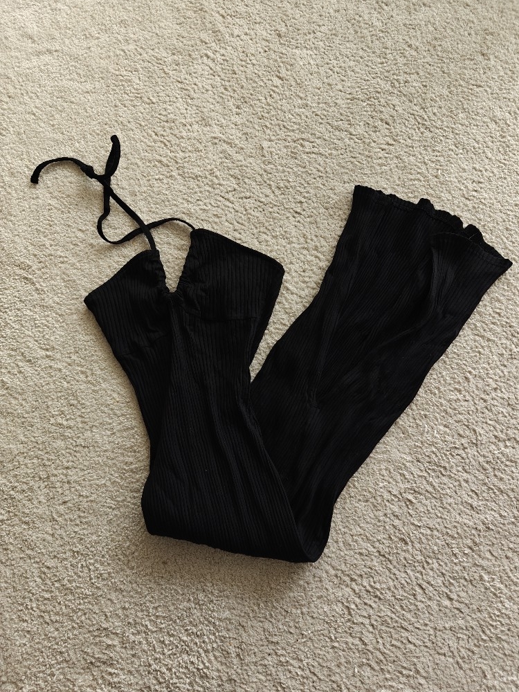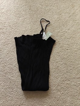 Black rib-knitted dress with a ribbon detail at the front. Size XS, tags attached so unworn. Back slit. Length reaches my calves.